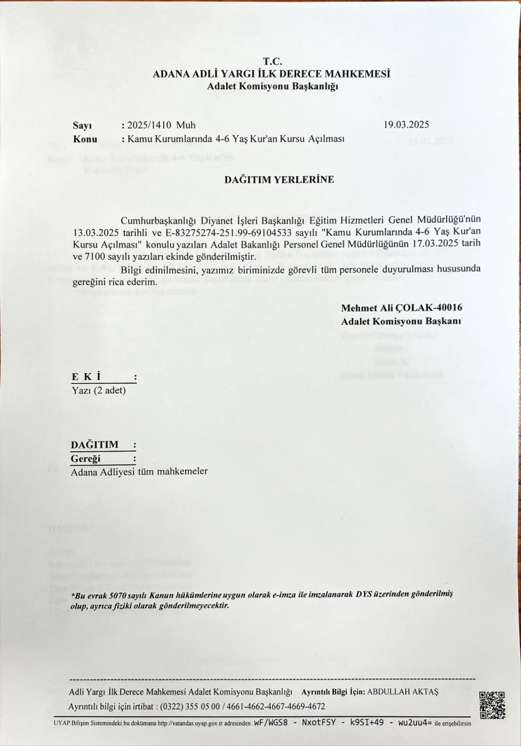 Bu yazı üzerine de adliyeler tüm mahkemelere duyuruyu yaptı. Bu kapsamda Adana Adli Yargı İlk Derece Mahkemesi Adalet Komisyonu Başkanlığı, dün Adana Adliyesi bütün mahkemelere tüm görevlilere duyurulması için yazı gönderdi.
