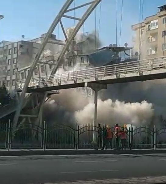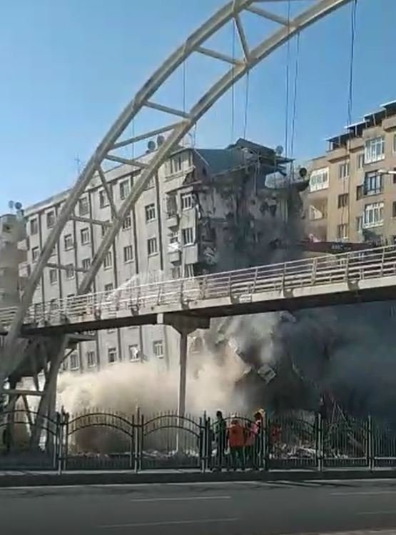 KAHRAMANMARAŞ merkezli sarsıntılardan etkilenen vilayetlerden Diyarbakır’da, Seyrantepe köprülü kavşağı yakınında bulunan ve risk nedeniyle tahliye edilen 9 katlı Altınkaya Apartmanı, yıkım sırasında çöktü. Bu anlar, kameraya yansırken, kimsenin yaralanmadığı çökme sonucu oluşan enkaz, iş makineleriyle kaldırılıyor.