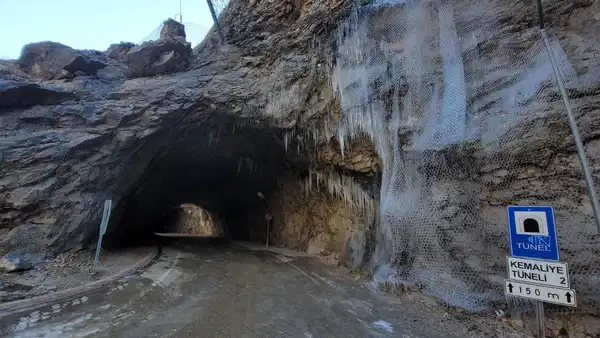 Doğu’da hafta sonu etkili olan kar yağışı yerini dondurucu soğuklara bıraktı. Soğuk hava nedeniyle Erzincan’ın Kemaliye ilçesini İç Anadolu’ya bağlamak amacıyla 1870’li yıllarda inşasına başlanan, devlet desteğiyle 2002 yılında tamamlanan, irili ufaklı tünellerin bulunduğu 7 kilometrelik taş yol, soğuk hava nedeniyle buz tuttu. Fırat Nehri kıyısında Kemaliye’den Divriği ilçesine uzanan 7 kilometrelik taş yoldaki tüneller, soğuk hava nedeniyle buz sarkıtlarıyla kaplandı. Tünellerde ulaşımı tehlikeye sokan buz sarkıtları, Kemaliye Belediyesi ekipleri tarafından kırılmaya başlandı.