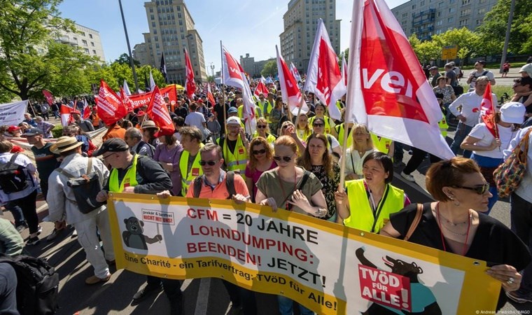 Almanya’da 1890’dan bu yana emek mücadelesinin sembolü olan 1 Mayıs, ülke genelinde onlarca gösteriyle kutlandı. Berlin’de belediye binası önünde düzenlenen gösteriye 5 binden fazla kişi katıldı. Talepler arasında yüksek ücret ve sosyal güvenlik ön plana çıkıyor.
