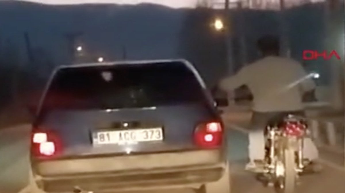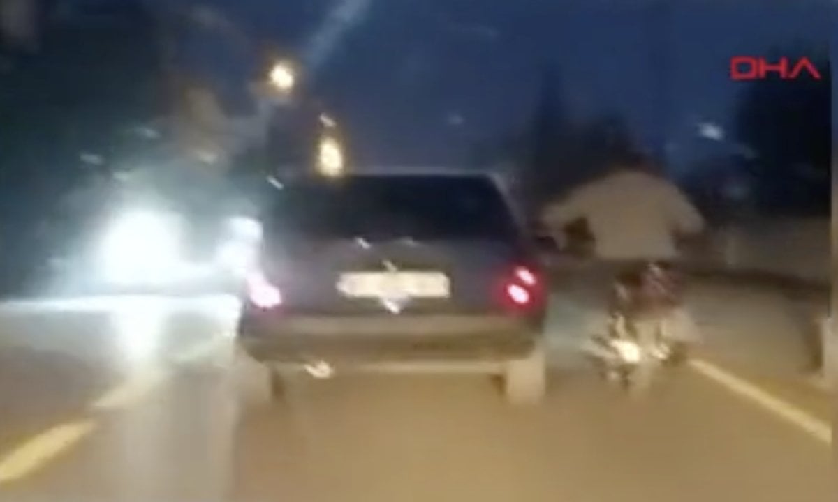 Bir motosiklet sürücüsü, bir eli ile motosikleti kontrol etmeye çalışırken bir eliyle bir otomobilin kapı kolundan tutarak dakikalarca bu şekilde yolculuk etti.