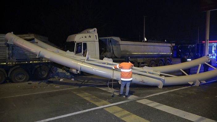 Düzce’de D-100 yolu Kaynaşlı mevkisinde İstanbul istikametine giden Anıl Karabıyık idaresindeki çelik konstrüksiyon yüklü tırın Bolu Dağı’ndan inerken frenleri boşaldı.