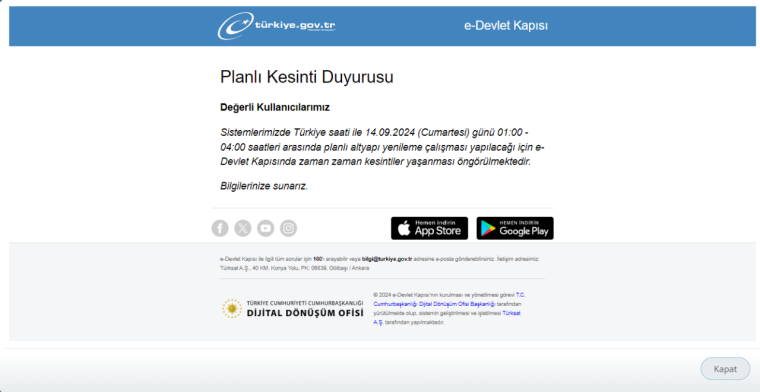 “Değerli Kullanıcılarımız, sistemlerimizde Türkiye saati ile 14.09.2024 (Cumartesi) günü 01.00-04.00 saatleri arasında planlı altyapı yenileme çalışması yapılacağı için e-Devlet Kapısında zaman zaman kesintiler yaşanması öngörülmektedir. Bilgilerinize sunarız.”