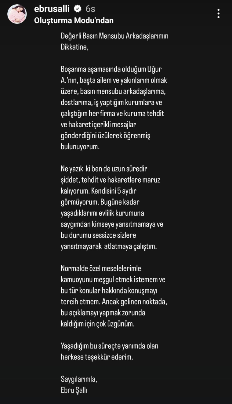 “Boşanma aşamasında olduğum Uğur A.’nın, başta ailem ve yakınlarım olmak üzere, basın mensubu arkadaşlarıma, dostlarıma, iş yaptığım kurumlara ve çalıştığım her firma ve kuruma tehdit ve hakaret içerikli mesajlar gönderdiğini üzülerek öğrenmiş bulunuyorum.