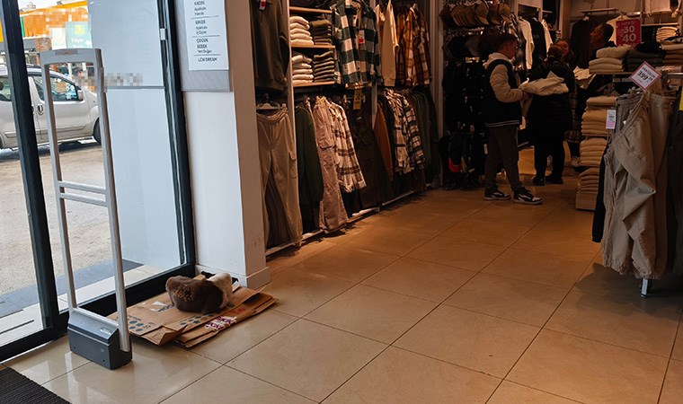Mağaza çalışanları, bitkin haldeki köpeğin karnını doyurarak içeri aldı. Köpek, mağazanın içinde altına konulan kartonun üzerinde yatarak ısındı.