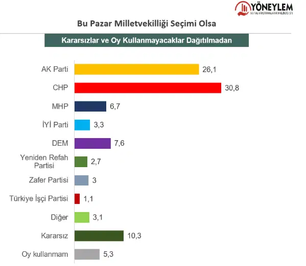 AKP’nin oy desteği yüzde 31 olurken, DEM Parti’ye “oy veririm” diyenlerin oranı yüzde 9, MHP diyenlerin oranı ise yüzde 8 oldu.