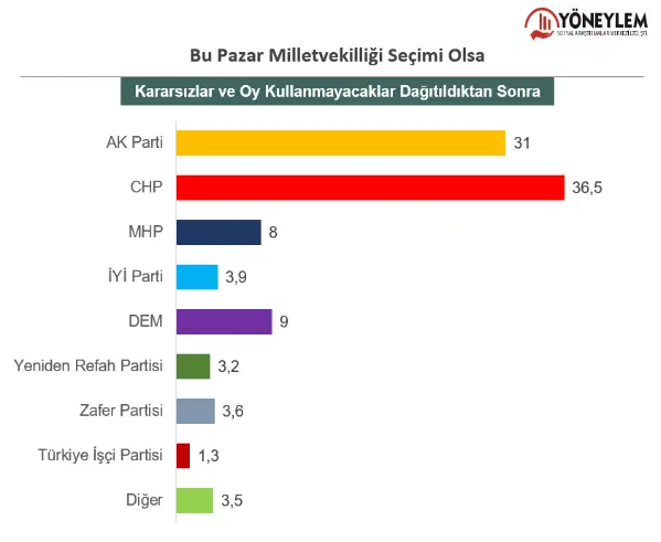 Kararsızlıklar dağıtıldıktan sonra ise CHP’nin yüzde 36,5 ile birinci parti olduğu görüldü.
