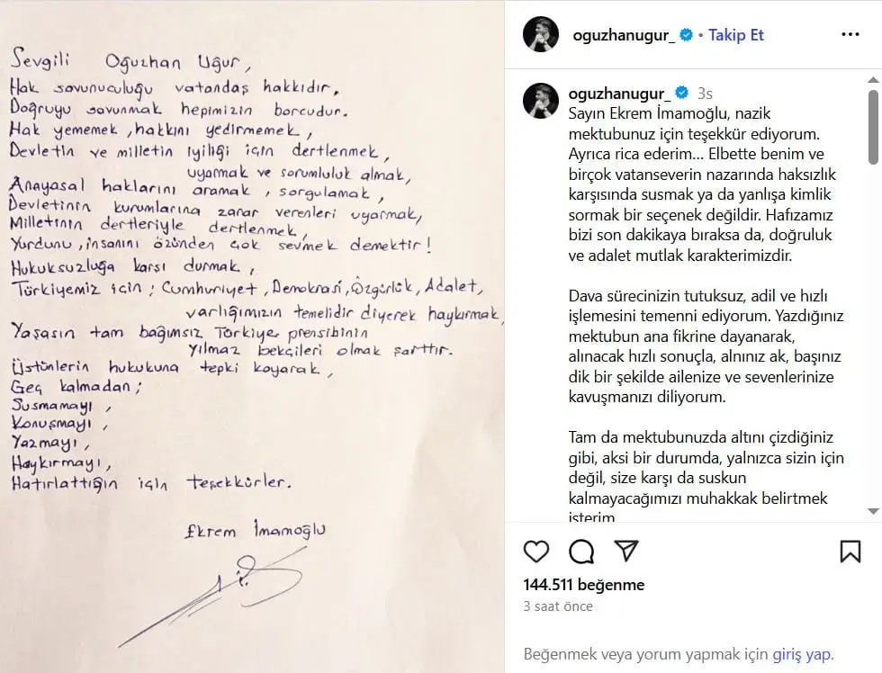İmamoğlu, Oğuzhan Uğur’a yazığı mektubunda şunları söyledi: