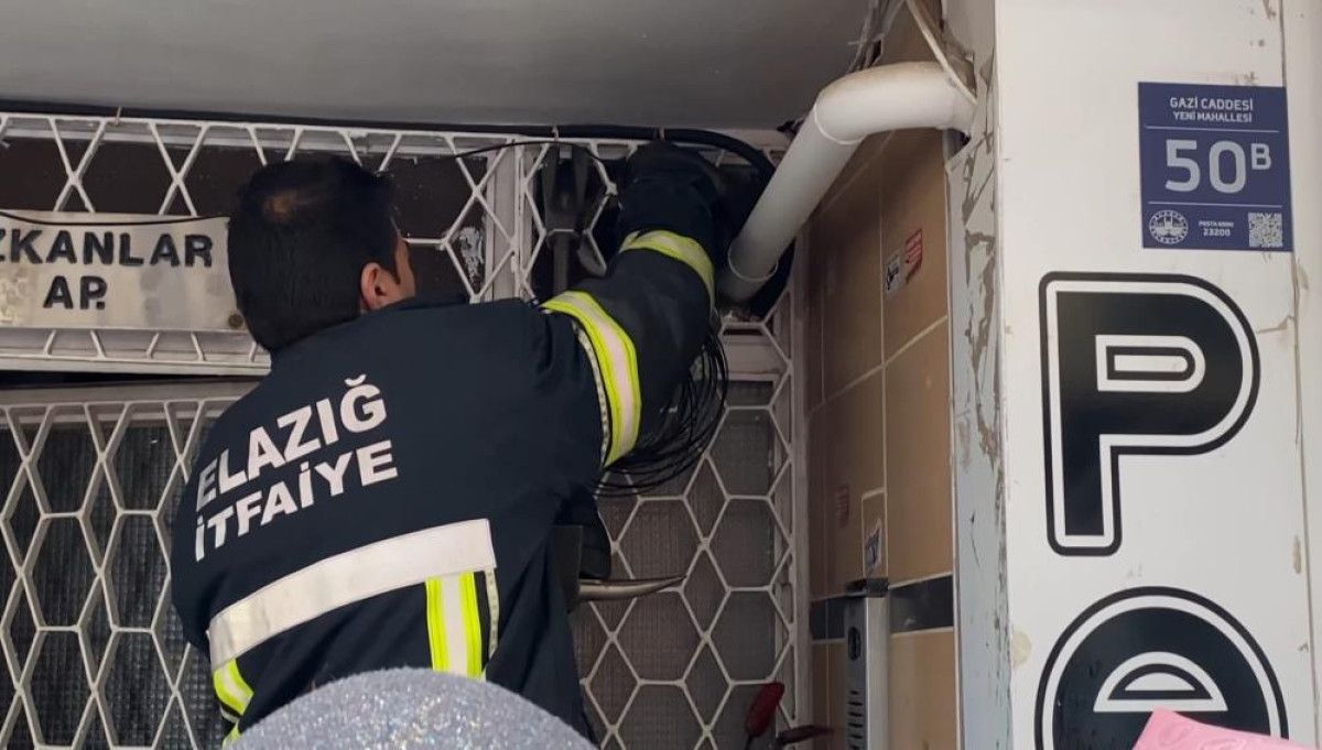 Elazığ’da Yeni Mahalle Gazi Caddesi üzerinde bulunan bir apartmanın dış kapısının demir korkuluklarına bir kedinin sıkıştığı bildirildi.