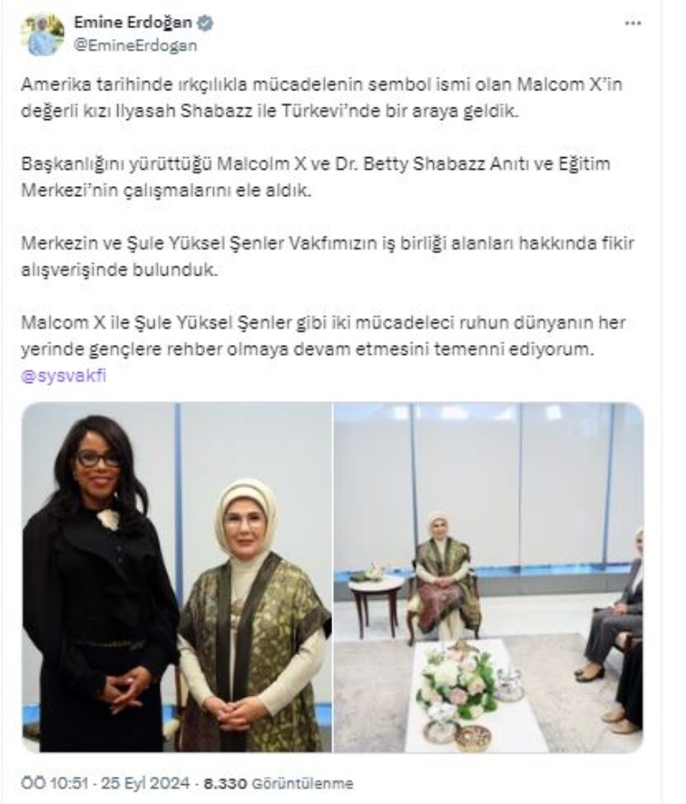 Emine Erdoğan görüşmeye ilişkin, sosyal medya platformu X’teki hesabı üzerinden yaptığı açıklamada, “Amerika tarihinde ırkçılıkla mücadelenin sembol ismi olan Malcom X’in değerli kızı Ilyasah Shabazz ile Türkevi’nde bir araya geldik. Başkanlığını yürüttüğü Malcolm X ve Dr. Betty Shabazz Anıtı ve Eğitim Merkezi’nin çalışmalarını ele aldık. Merkezin ve Şule Yüksel Şenler Vakfımızın iş birliği alanları hakkında fikir alışverişinde bulunduk. Malcom X ile Şule Yüksel Şenler gibi iki mücadeleci ruhun dünyanın her yerinde gençlere rehber olmaya devam etmesini temenni ediyorum” dedi.