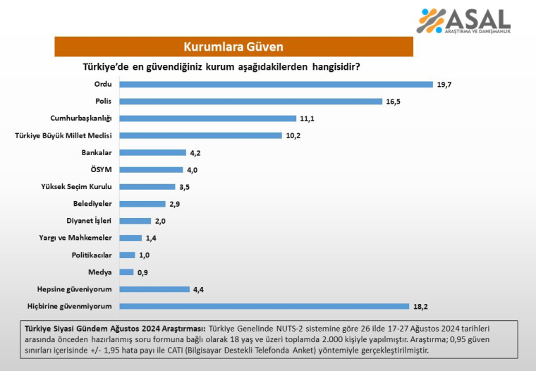 Asal Araştırma katılımcılara Türkiye’de en güvendikleri kurumu sordu. Katılımcıların en çok güvendikleri kurum yüzde 19,7 ile ordu olurken en az güvendikleri kurum yüzde 0,9 ile medya oldu.