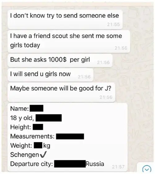 Dosyada ayrıca “Belki J için uygun biri çıkabilir” ifadelerinin yer aldığı, insan ticaretiyle ilgili mesajlaşmalara ait bir ekran görüntüsü de yer aldı.
