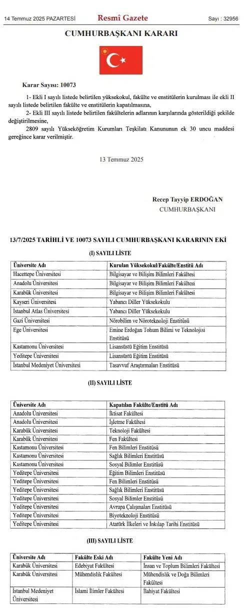 Erdoğan’ın imzasıyla alınan karara göre, 4 üniversitede 14 fakülte ve enstitü kapatılırken 10 üniversitede ise yeni enstitü açıldı.