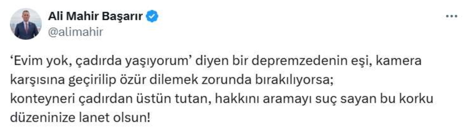 Başarır, “‘Evim yok, çadırda yaşıyorum’ diyen bir depremzedenin eşi, kamera karşısına geçirilip özür dilemek zorunda bırakılıyorsa; konteyneri çadırdan üstün tutan, hakkını aramayı suç sayan bu korku düzeninize lanet olsun!” ifadelerini kullandı.