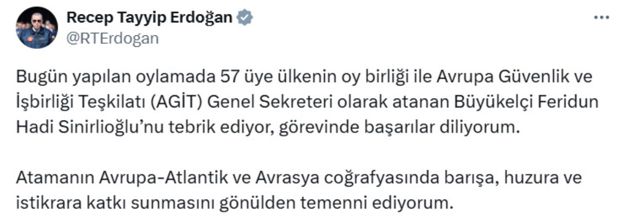 Erdoğan, sosyal medya hesabı üzerinden Avrupa Güvenlik ve İşbirliği Teşkilatı (AGİT) Genel Sekreteri olarak atanan Büyükelçi Feridun Hadi Sinirlioğlu’nu tebrik etti.