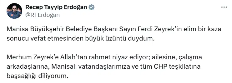 “Manisa Büyükşehir Belediye Başkanı Sayın Ferdi Zeyrek’in elim bir kaza sonucu vefat etmesinden büyük üzüntü duydum.