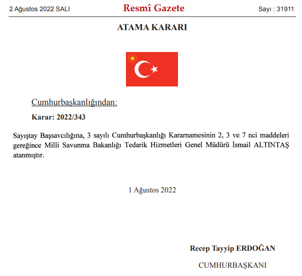 Resmi Gazete’de yayımlanan karada, “Sayıştaş Başsavcılığı’na 3 sayılı Cumhurbaşkanlığı Kararnamesi’nin 2, 3, ve 7’nci hususları mucibince Ulusal Savunma Bakanlığı Tedarik Hizmetleri Genel Müdürü İsmail Altıntaş atanmıştır” tabiri yer aldı.