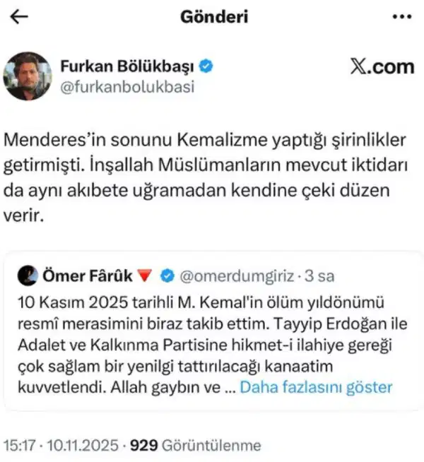 Ömer Faruk adlı sosyal medya kullanıcısının, “10 Kasım 2025 tarihli M.Kemal’in ölüm yıldönümü resmi merasimini biraz takip ettim. Tayyip Erdoğan ile Adalet ve Kalkınma Partisine hikmet-i ilahiye gereği çok sağlam bir yenilgi tattırılacağı kanaatim kuvvetlendi…” paylaşımına yanıt veren Bölükbaşı, şu ifadeleri kullandı: