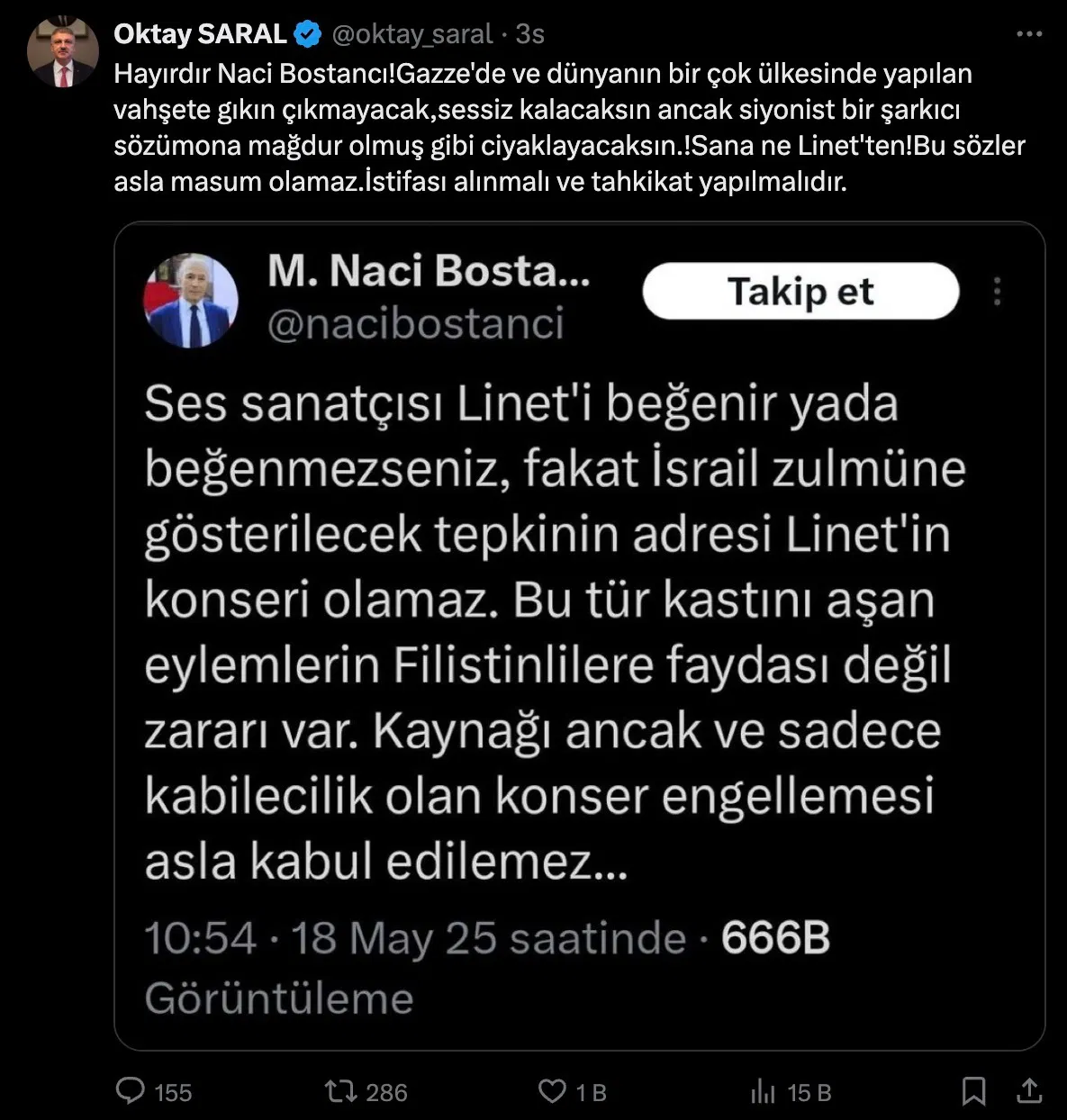 “Hayırdır Naci Bostancı! Gazze’de ve dünyanın birçok ülkesinde yapılan vahşete gıkın çıkmayacak, sessiz kalacaksın; ancak siyonist bir şarkıcı sözüm ona mağdur olmuş gibi ciyaklayacaksın! Sana ne Linet’ten! Bu sözler asla masum olamaz. İstifası alınmalı ve tahkikat yapılmalıdır.”