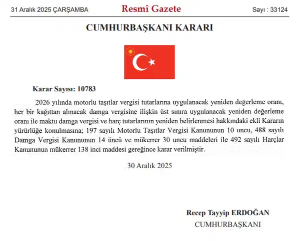 Resmi Gazete’de yayımlanan Cumhurbaşkanı Kararı ile 2026 yılında motorlu taşıtlar vergisi (MTV), damga vergisi ve maktu harç tutarlarına uygulanacak yeniden değerleme oranı yüzde 18,95 olarak belirlendi.
