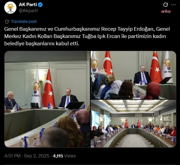 AKP’nin resmi sosyal medya hesabından yapılan paylaşımda, “Genel Başkanımız ve Cumhurbaşkanımız Recep Tayyip Erdoğan, Genel Merkez Kadın Kolları Başkanımız Tuğba Işık Ercan ile partimizin kadın belediye başkanlarını kabul etti” ifadelerine yer verildi.