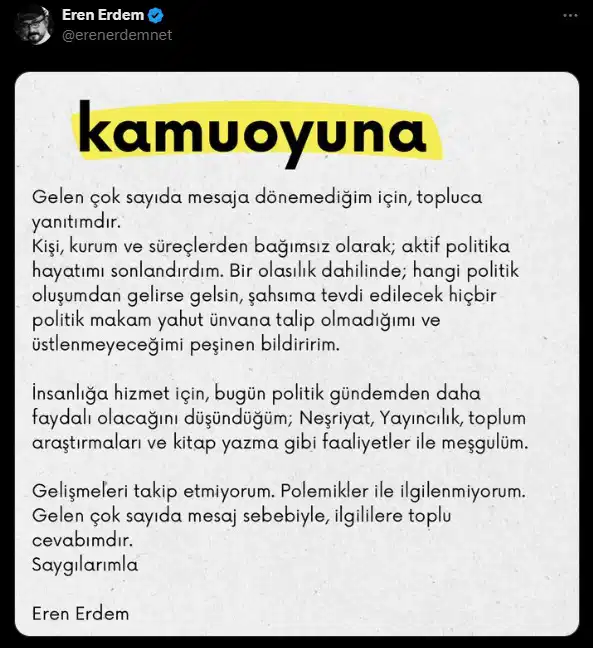 Erdem, sosyal medya hesabından yaptığı açıklamada, “Gelen çok sayıda mesaja dönemediğim için, topluca yanıtımdır. Kişi, kurum ve süreçlerden bağımsız olarak; aktif politika hayatımı sonlandırdım” ifadelerini kullandı.