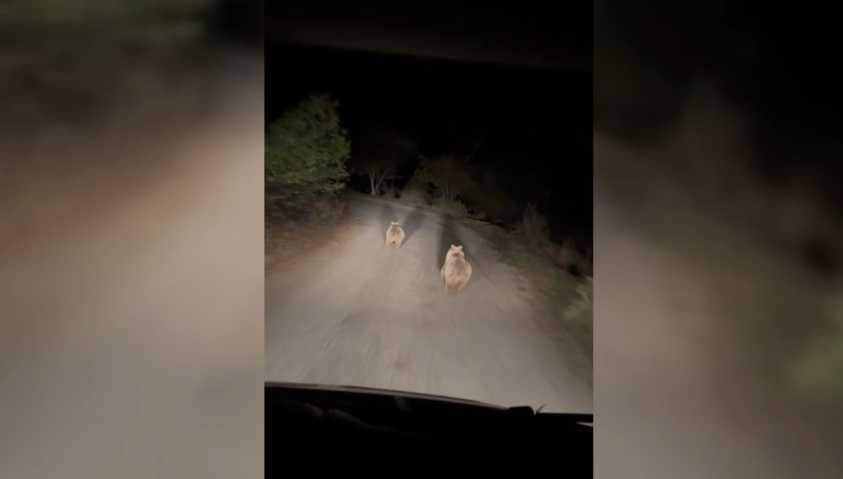 Daha sonra görüntülediği yavru ayıların annesini de bulan sürücü o anları da kaydetmeyi başardı. Anne ayı da otomobilin ışığıyla bir süre süratle koştuktan sonra boş tarla arazisinden dağlık alana doğru giderek gözden kayboldu.