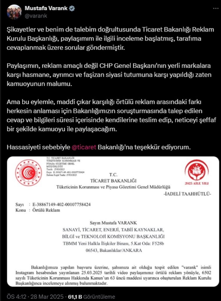 “Şikayetler ve benim de talebim doğrultusunda Ticaret Bakanlığı Reklam Kurulu Başkanlığı, paylaşımım ile ilgili inceleme başlatmış, tarafıma cevaplanmak üzere sorular göndermiştir. Paylaşımın, reklam amaçlı değil CHP Genel Başkanı’nın yerli markalara karşı hasmane, ayrımcı ve faşizan siyasi tutumuna karşı yapıldığı zaten kamuoyunun malumu.