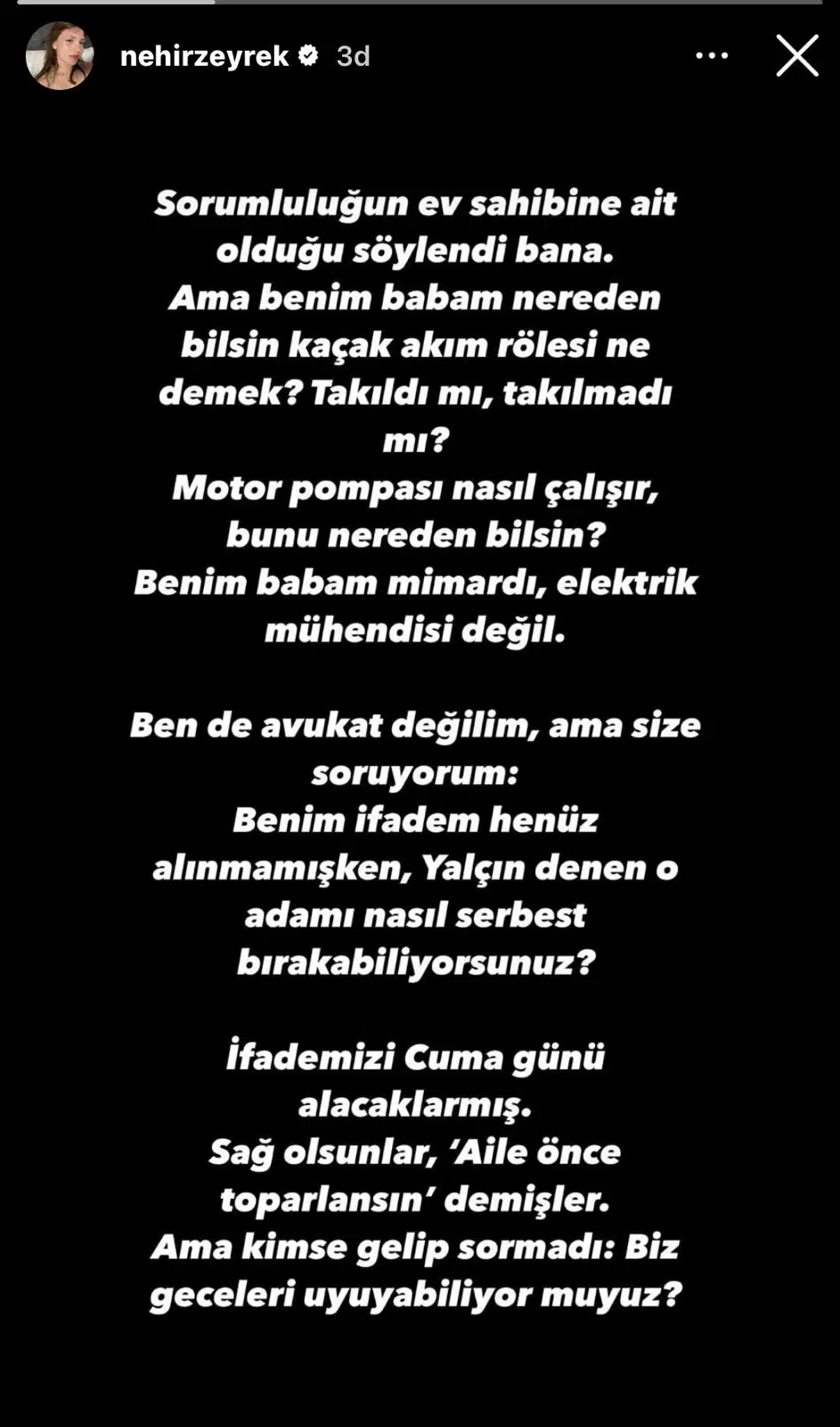 Nehir Zeyrek, “Ben de avukat değilim, ama size soruyorum: Benim ifadem henüz alınmamışken, Yalçın denen o adamı nasıl serbest bırakabiliyorsunuz?” dedi.
