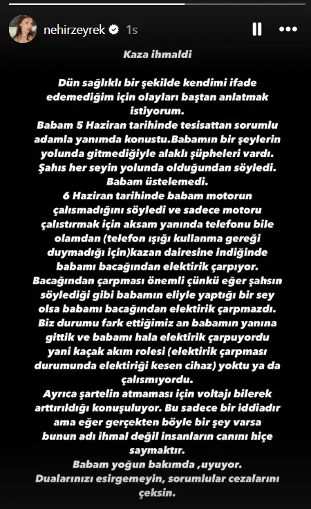 Söz konusu durumun ardından Zeyrek’in kızı Nehir Zeyrek, sosyal medya hesabı üzerinden yaşananları anlattığı bir paylaşımda bulundu.