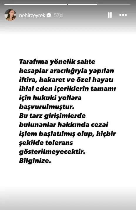 “Tarafıma yönelik sahte hesaplar aracılığıyla yapılan iftira, hakaret ve özel hayatı ihlal eden içeriklerin tamamı için hukuki yollara başvurulmuştur. Bu tarz girişimlerde bulunanlar hakkında cezai işlem başlatılmış olup, hiçbir şekilde tolerans gösterilmeyecektir. Bilginize”
