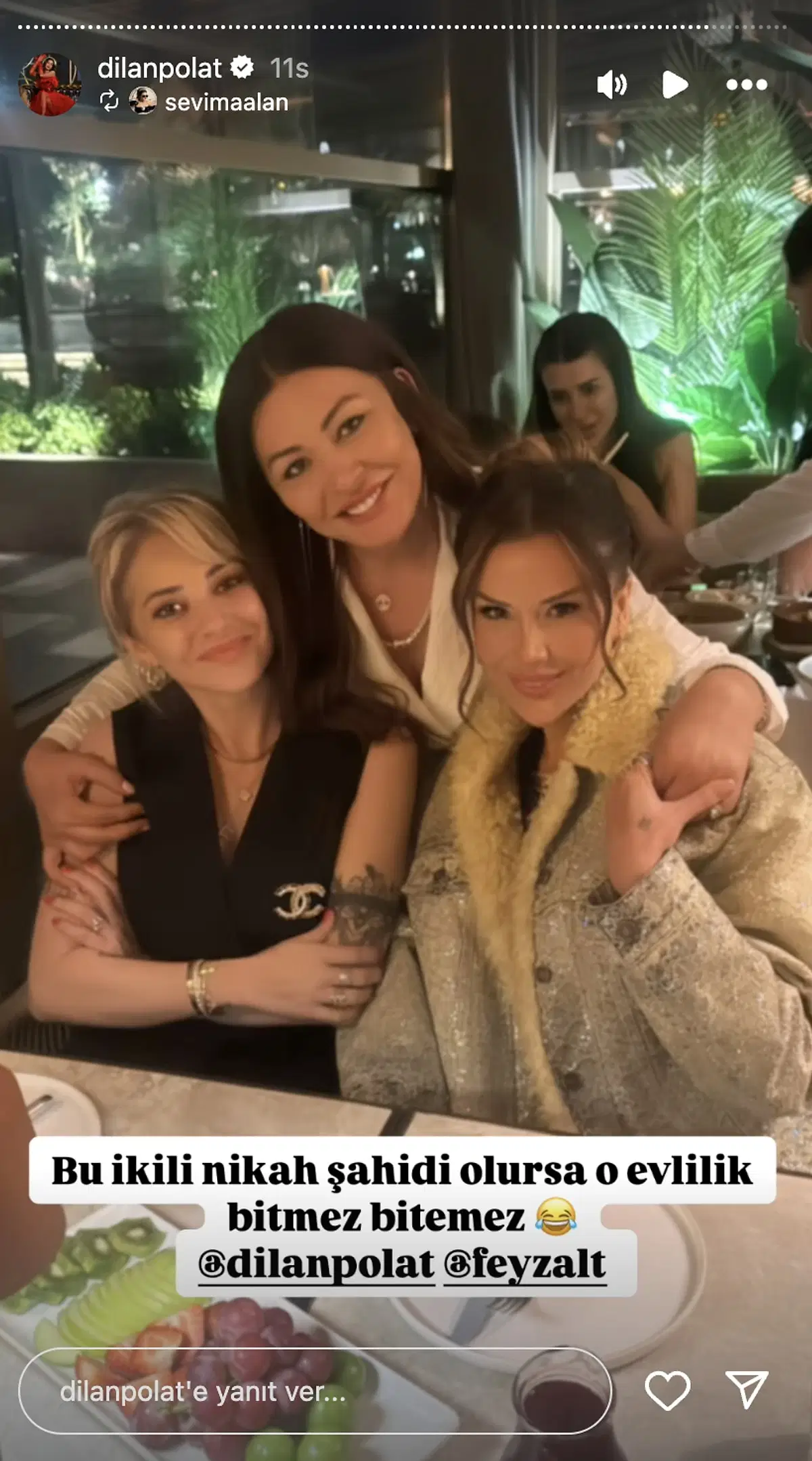 Aralarındaki anlaşmazlık ile bilinen Feyza Altun ve Dilan Polat, ortak arkadaşları Sevim Alan’ın düğününde nikah şahidi oldu. Feyza Altın ve Dilan Polat’ın birlikte paylaştıkları fotoğraflar sosyal medyada gündem oldu.