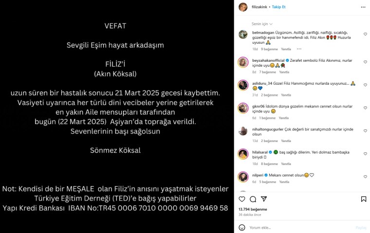 Filiz Akın’ın eşi Sönmez Köksal, ünlü sanatçının resmi Instagram hesabından yaymnladığı mesajda “Sevgili eşim, hayat arkadaşım Filiz’i (Akın Köksal) uzun süren bir hastalık sonucu 21 Mart gecesi kaybettim. Vasiyeti uyarınca her türlü dini vecibeler yerine getirilerek en yakın aile mensupları tarafından bugün Aşiyan’da toprağa verildi. Sevenlerinin başı sağ olsun…” ifadelerini kullandı.