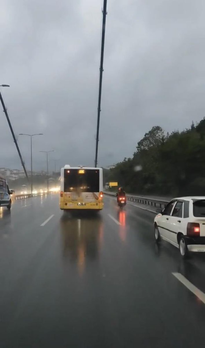 İstanbul’da etkili olan yağış ve rüzgar nedeniyle bir motosikletli, Fatih Sultan Mehmet Köprüsü’nde ilerlemekte zorlanınca seyir halinde olan İETT otobüsü sürücüsü, motosiklet sürücüsüne siper oldu.