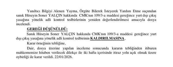 İstanbul 40. Ağır Ceza Mahkemesi, 9 Mart’ta yapılacak ilk duruşma öncesinde Yalçın hakkındaki adli kontrol tedbirini değerlendirdi ve kaldırılmasına karar verdi. Ara karar ile Yalçın’ın yurt dışına çıkış yasağı kaldırılmış oldu.