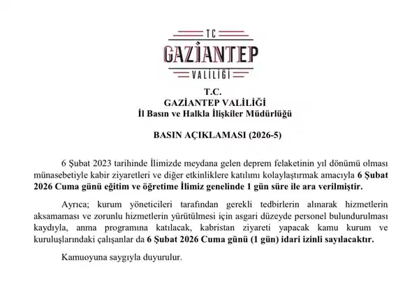 Gaziantep Valiliği tarafından yapılan açıklamada kabir ziyaretleri ve diğer etkinlikler gereği 1 gün eğitim ve öğretime ara verileceği bildirildi.
