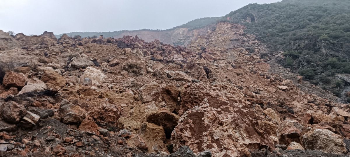Burada büyük kütleler aşağıya doğru kaymış ama bu heyelanın işi henüz bitmemiş. Yukarıda gördüğüm kadarıyla henüz akmamış, devrilmemiş kısımlar da var. Bu heyelan küçük olsa da devam edecek. Büyük blokların burada olması, bir bakıma faydalı; topuk vazifesi görecek. Ama geride henüz kayma potansiyeli olan müsait yerleri görmek mümkün.