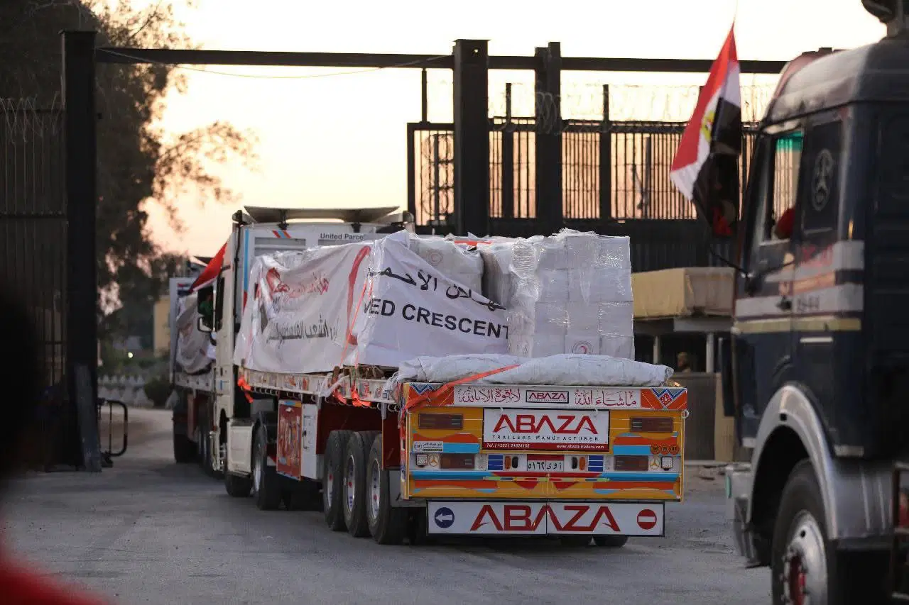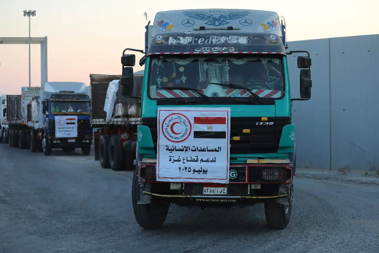 Mısır Kızılayı’nın pankartlarını taşıyan yardım yüklü araçların, Gazze’ye giriş için Kerem Şalom Sınır Kapısı’na yöneldiği aktarıldı.