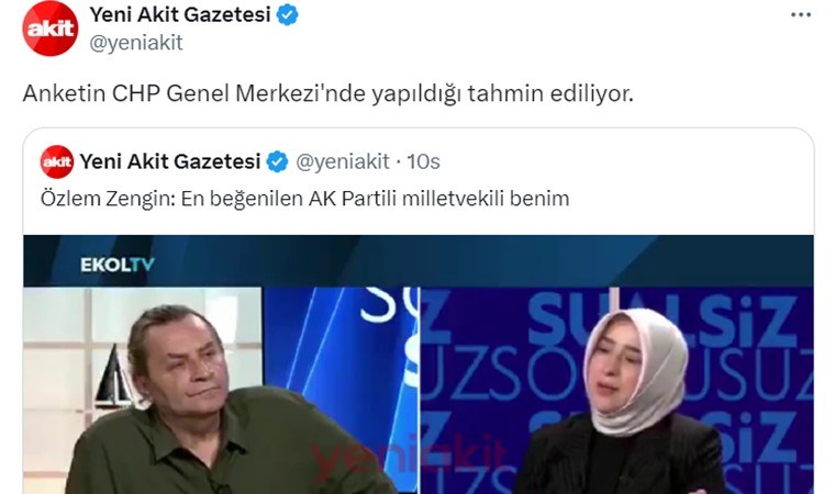 Zengin’i Ekol TV’de katıldığı bir programda söylediği “Anketlerde en beğenilen milletvekili seçiliyorum” ifadeleri üzerinden hedef alan Yeni Akit, söz konusu haberi ‘CHP Genel Merkezi’nde yapıldığı tahmin edilen’ şeklinde sundu.