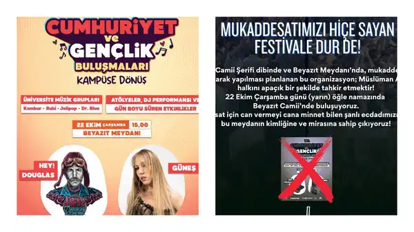 Sosyal medyadan bildiri yayımlayan gericiler, meydandaki camiye olan hassasiyetlerini gerekçe göstererek Beyazıt Meydanı’nda konser saatinde toplanma çağrısı yaptı.