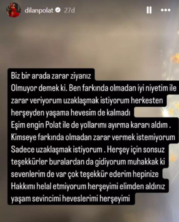 Dilan Polat sosyal medya hesabından yaptığı paylaşımda “Biz bir arada zarar ziyanız. Olmuyor demek ki. Ben farkında olmadan iyi niyetim ile zarar veriyorum uzaklaşmak istiyorum herkesten her şeyden yaşama hevesim de kalmadı. Eşim Engin Polat ile de yollarımı ayırma kararı aldım” dedi.