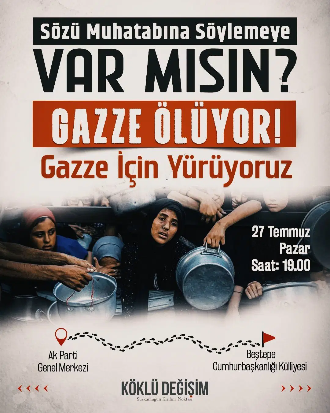 Sosyal medyadan yürüyüşü duyuran grup, Ankara’da, AKP Genel Merkezi’nden Cumhurbaşkanlığı Sarayı’na yürüyeceğini açıkladı.