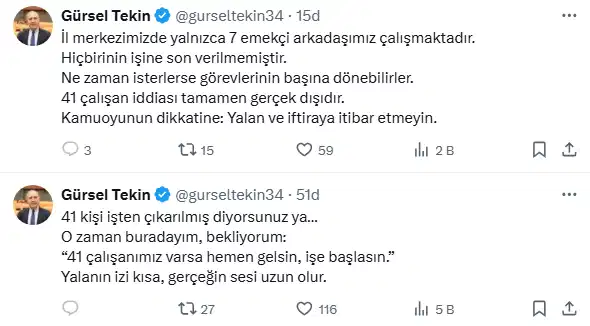 Tekin, “İl merkezimizde yalnızca 7 emekçi arkadaşımız çalışmaktadır. Hiçbirinin işine son verilmemiştir. Ne zaman isterlerse görevlerinin başına dönebilirler. 41 çalışan iddiası tamamen gerçek dışıdır. Kamuoyunun dikkatine: Yalan ve iftiraya itibar etmeyin” dedi.