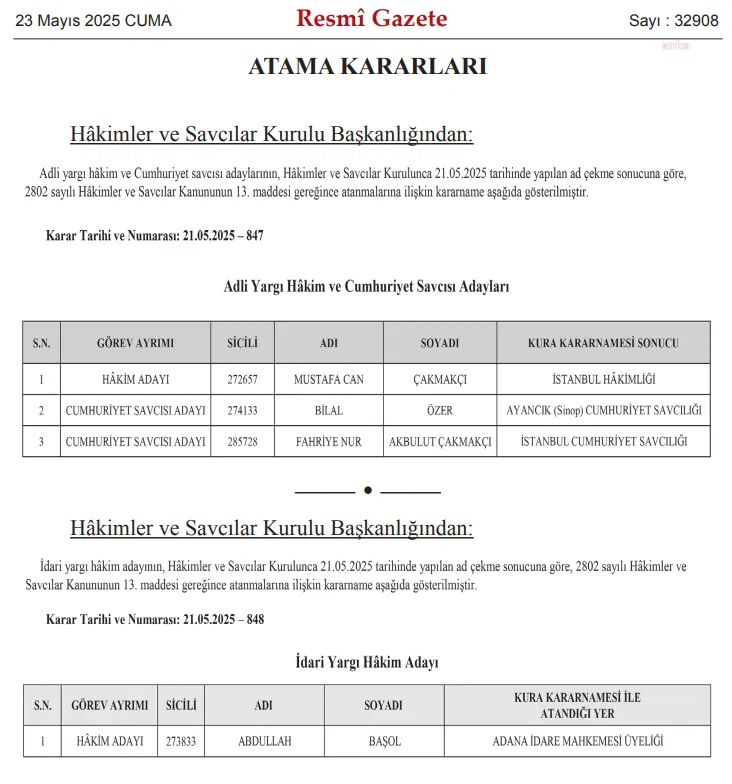 HSK’nın 21 Mayıs 2025 tarihli ve 847 sayılı kararı ile adli yargıda görev yapacak hakim ve savcı adayları, kura usulüyle yeni görev yerlerine atandı. Aynı tarihli 848 sayılı kararnameyle ise bir idari yargı hakim adayı görevlendirildi.