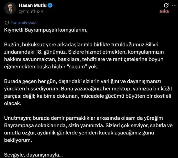 CHP’li belediyelere yönelik son operasyonlar kapsamında 17 Eylül’de tutuklanan Bayrampaşa Belediye Başkanı Hasan Mutlu, sosyal medya hesabından yeni bir paylaşımda bulundu.