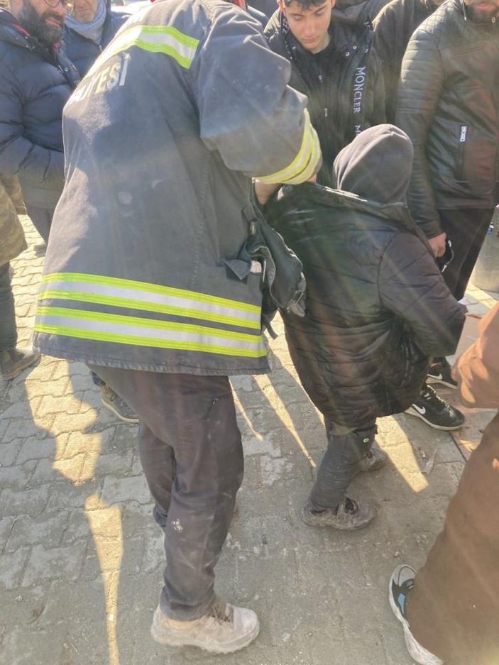 Hatay’da bir binanın enkazında kurtarma çalışmasına katılan Erzurum İtfaiye Daire Başkanlığı Arama Kurtarma Ekibi’nde görevli bir personel, çalışmaya ara verdiği sırada alanda üşümüş bir çocuğu fark edince, yardım malzemelerinin olduğu yerden bir çift eldiven ve bir mont getirdi.