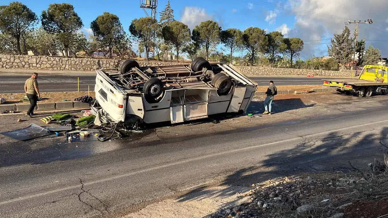Hatay’da takla atarak ters dönen servis midibüsündeki 25 tarım işçisi yaralandı.