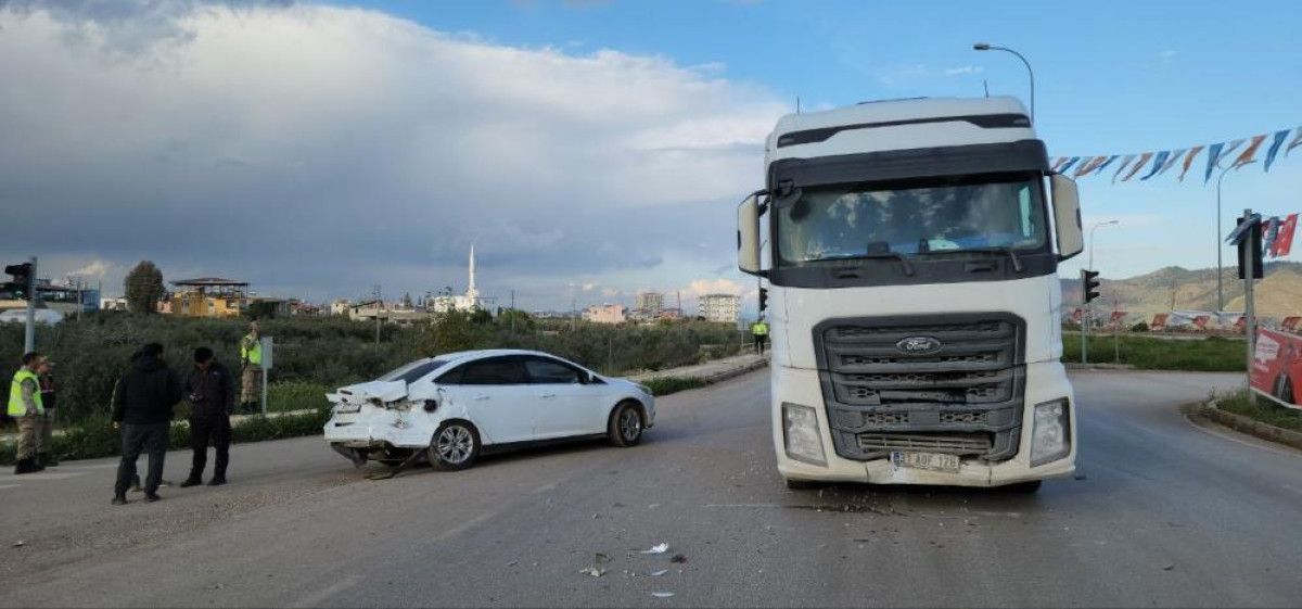 Hatay-Gaziantep yolu Hassa ilçesi Aktepe Mahallesi mevkiinde Fatih K. yönetimindeki 31 AGY 03 plakalı otomobil, kavşakta İzettin C. idaresindeki 31 AOF 129 plakalı Ford marka tırla çarpıştı.