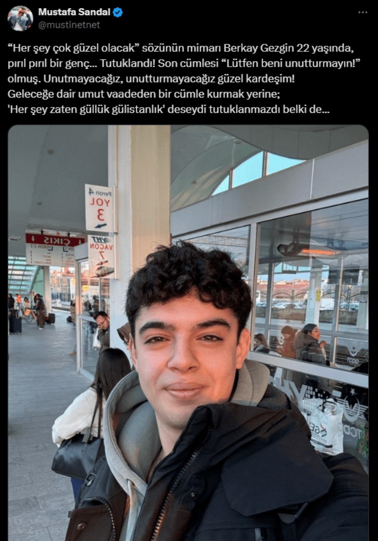 “Her şey çok güzel olacak” sözünün mimarı Berkay Gezgin 22 yaşında, pırıl pırıl bir genç… Tutuklandı! Son cümlesi “Lütfen beni unutturmayın!” olmuş. Unutmayacağız, unutturmayacağız güzel kardeşim! Geleceğe dair umut vaadeden bir cümle kurmak yerine; ‘Her şey zaten güllük gülistanlık’ deseydi tutuklanmazdı belki de…