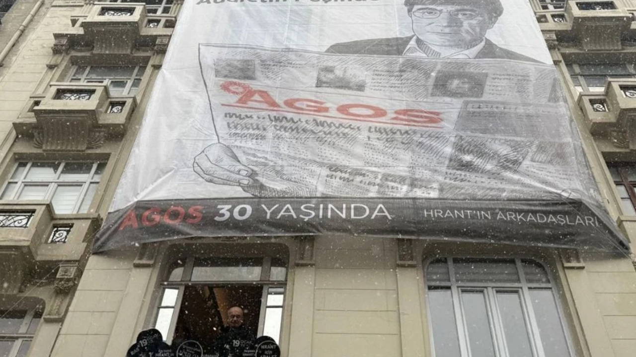 Sebat Apartmanı üzerinde Hrant Dink’in fotoğrafı ile ‘Hafıza hakikat hayat hasret’ yazısının yer aldığı afiş asıldı.